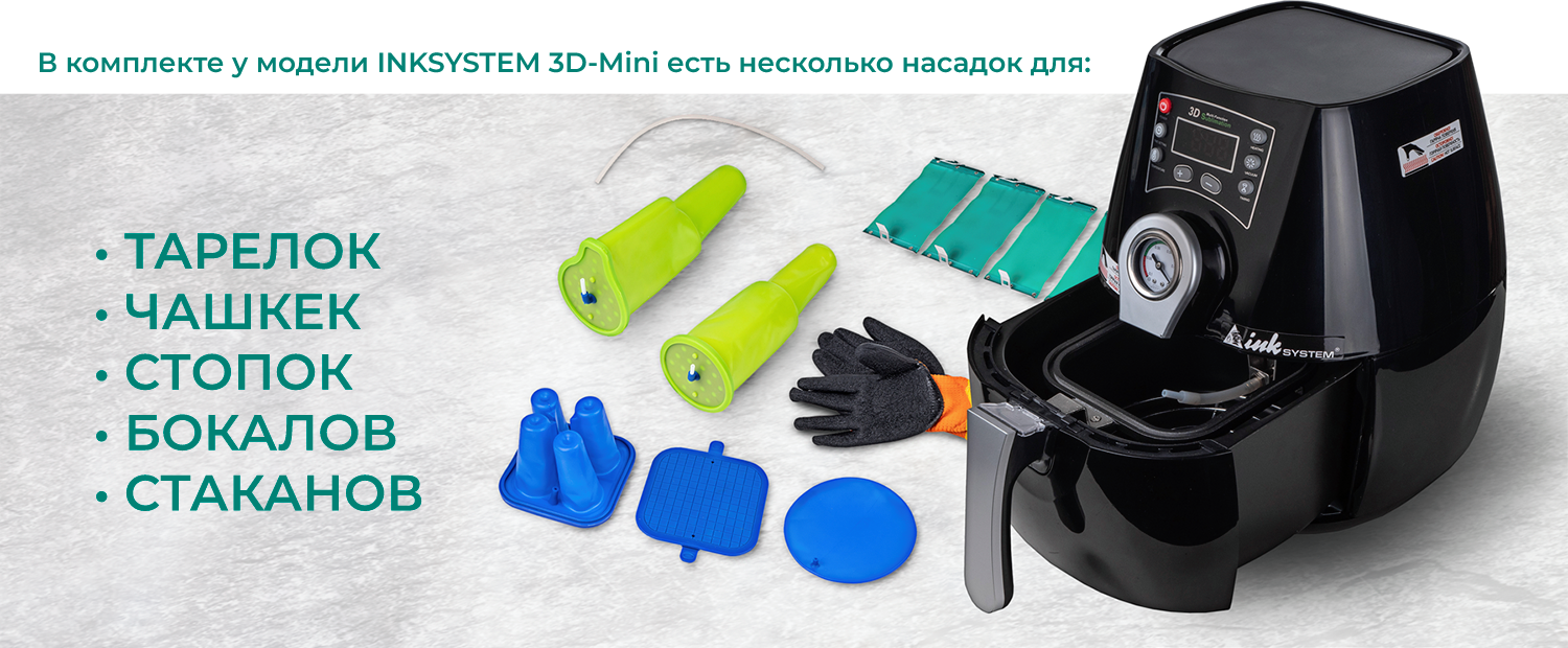 | Комплектация | перчатки, инструкция, Термопресс вакуумный INKSYSTEM 3D-Mini для кружек, 4 зажима для цилиндрических кружек 11OZ, 1 насадка для тарелок 8 дюймов, 1 силиконовая форма для стопок (на 4шт), 2 силиконовых формы для двусторонней печати на цилиндрических кружках с ручкой/ без ручки, 1 силиконовая форма для стандартной/фигурной кружки 11OZ |