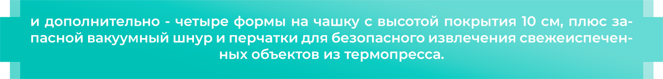 В комплект настольного термопресса дополнительно входят защитные перчатки, зажимы для стандартных, фигурных кружек цилиндрической формы 11OZ, изделий с ручками или без них. В набор включены силиконовые формы для стопок, тарелок, выполнения двухсторонней печати (для наружной и внутренней поверхностей).