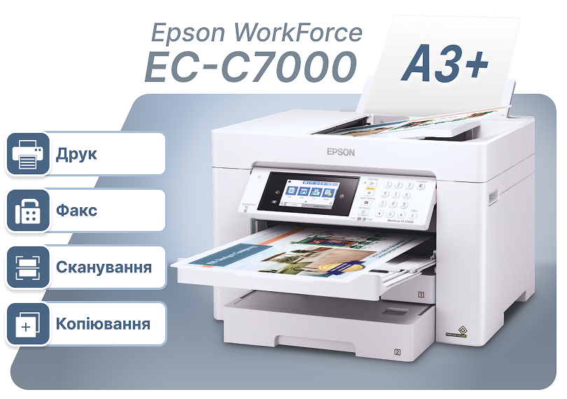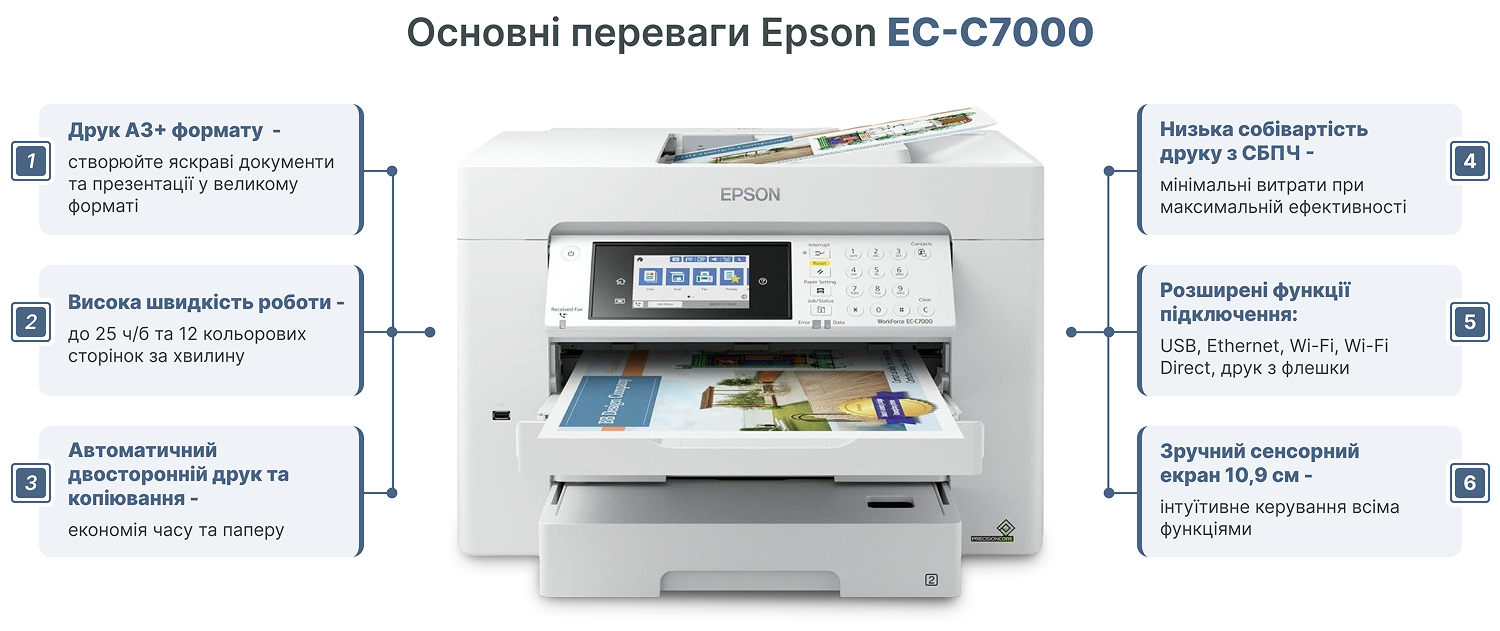 Epson WorkForce EC-C7000 — це універсальний МФУ формату А3, створений спеціально для офісів, яким потрібна висока швидкість, якість і надійність у щоденній роботі. Завдяки широким можливостям друку, сканування та копіювання, ця модель стане вашим незамінним помічником.