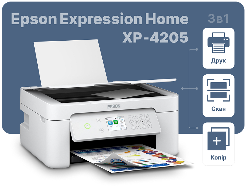 Epson XP‑4205 ідеальна багатофункціональна модель для дому й невеликого офісу. Компактний принтер «3‑в‑1» (друк, сканування, копіювання) з яскравим 2,4″ кольоровим дисплеєм забезпечує зручне налаштування без ПК – просто через сенсорне меню.