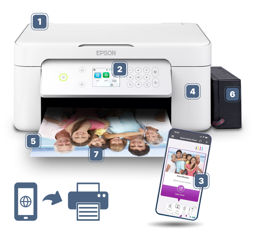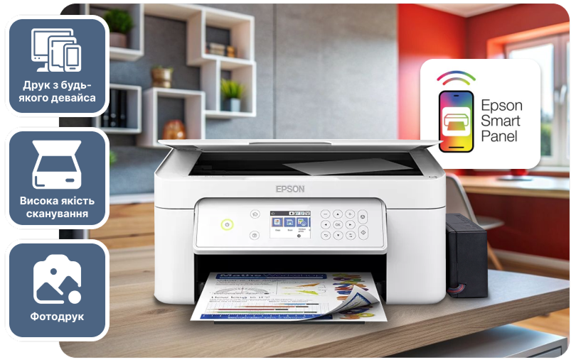 Сканер і копіювальний модуль забезпечують роздільну здатність до 1200 × 2400 dpi, що задовольнить домашні потреби (документи, фото, рецепти). Підтримка мобільного додатка Epson Smart Panel™ спрощує друк і контроль рівня чорнила прямо зі смартфона.